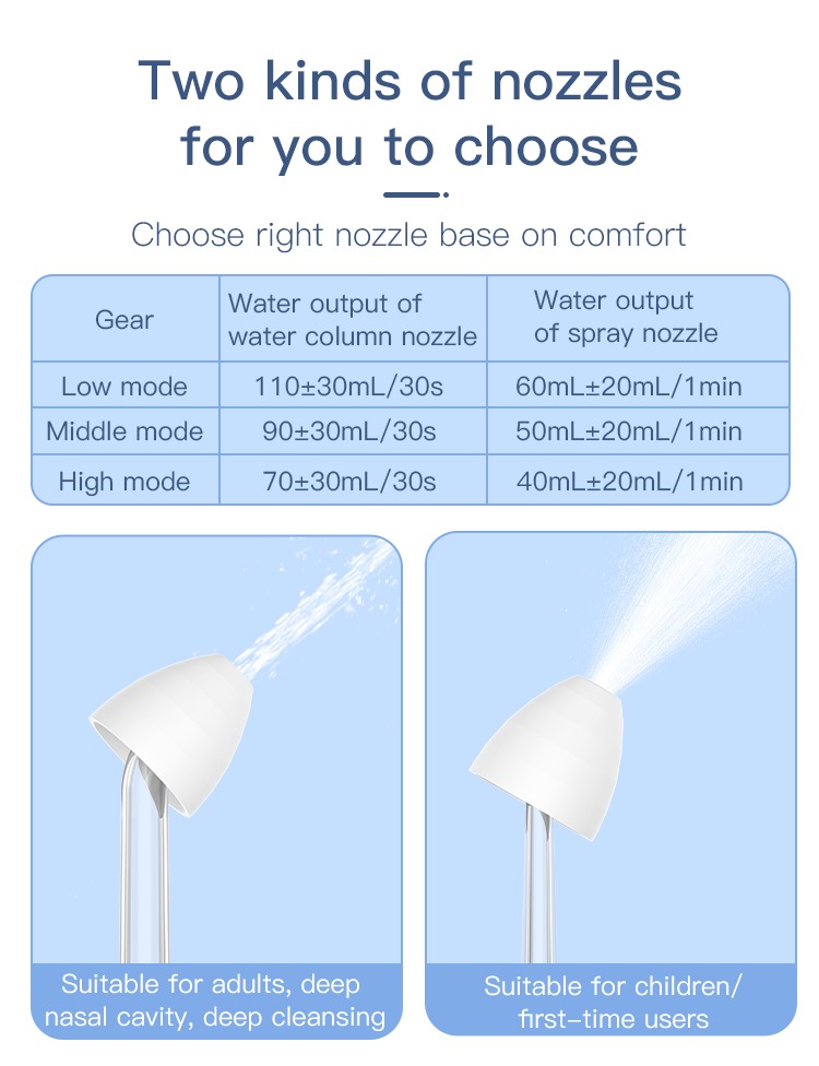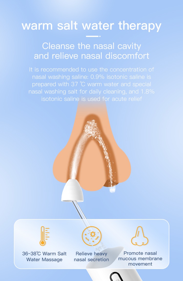 【Вращающиеся насадки на 90 градусов】 Конструкция вращающегося на 360 градусов наконечника очистителя носа более эффективна, чем Neti pot или другие устройства для промывания носа. Благодаря водонепроницаемой конструкции IPX7, ополаскиватель для носа позволяет промывать водой все тело, что облегчает очистку и уход за полостью носа. |