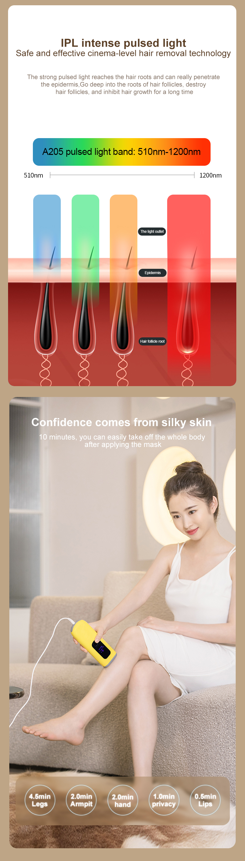 - Наслаждайтесь гладкой кожей и заметным уменьшением количества волос. После первых четырех недель лечения продолжайте подкрашивать волосы раз в две недели, чтобы выглядеть лучше круглый год. Конструкция плоского светового окна на основе сапфира воздействует на волосы у самых корней, обеспечивая при этом почти безболезненность и эффективность каждой вспышки.