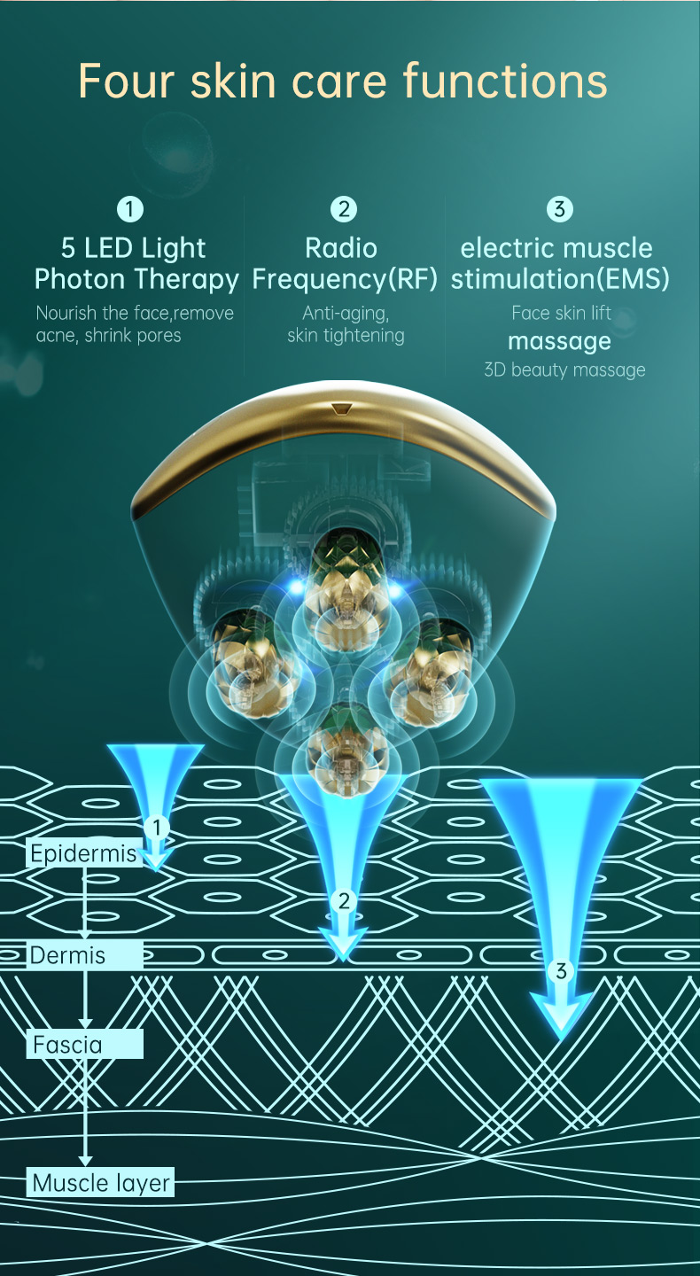 КАКОВЫ ПРЕИМУЩЕСТВА? -- Косметологический аппарат — это многофункциональное устройство против старения, которое включает в себя радиочастотную (РЧ) технологию с терапией красным/синим светом, EMS для уменьшения линий и морщин, улучшения проникновения в кожу, абсорбционных способностей и т. д.