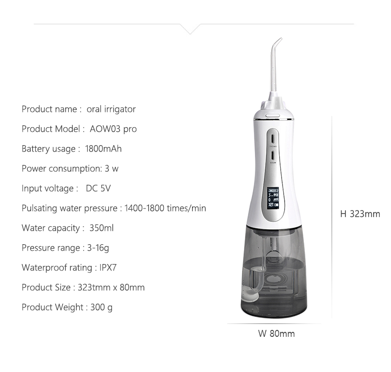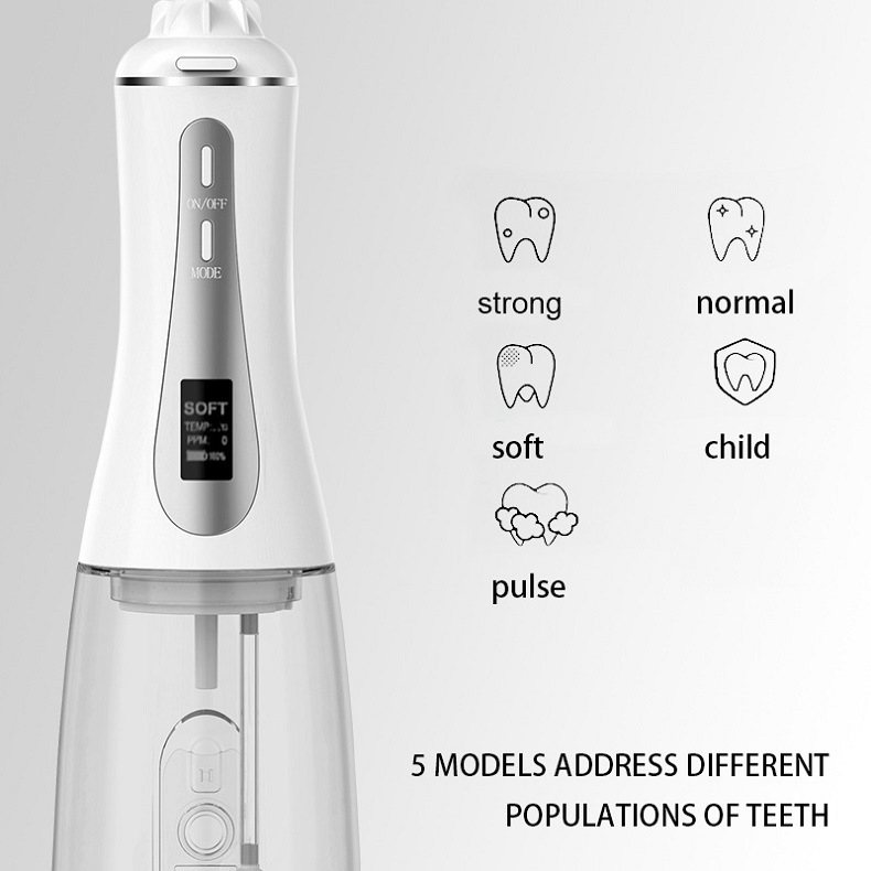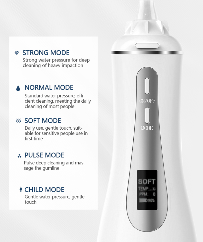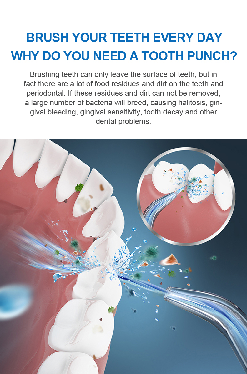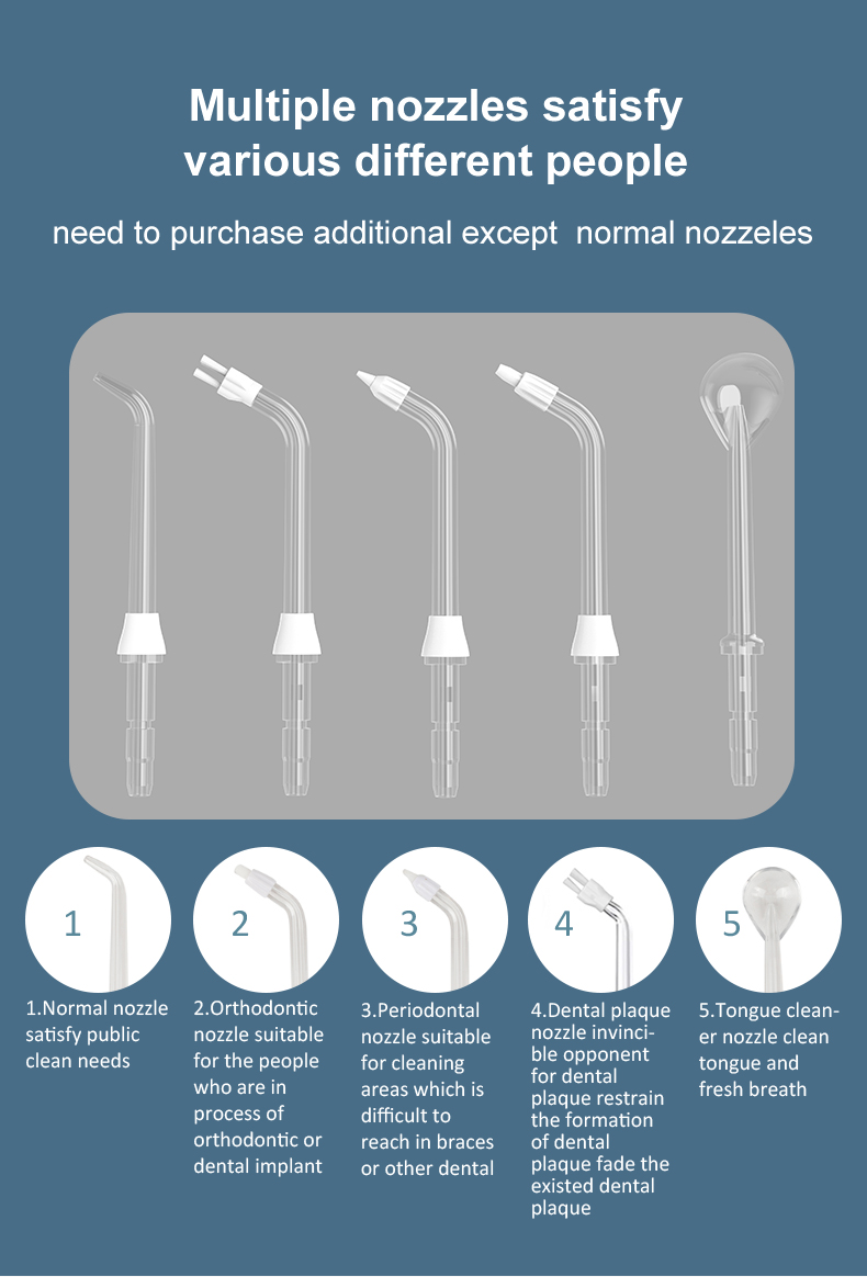 Этот водяной зубочист подает импульсы высокого давления воды с частотой 1400-1800 раз в минуту, эффективно удаляя 99,9% зубного налета для глубокой чистки зубов. Эта водная зубочистка массирует десны, улучшает кровообращение и решает проблемы полости рта, такие как неприятный запах изо рта и ортодонтические зубы.