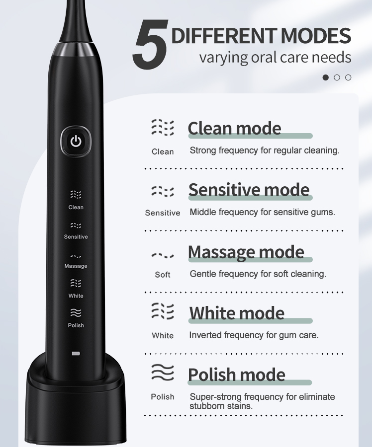 - 5 ВЫСОКОЭФФЕКТИВНЫХ РЕЖИМОВ ЧИСТКИ - Clean (бережная), White (интенсивная), Polish (интенсивная инвертированная частота), Milder (бережная инвертированная частота) и Sensitive (мягкая) - для соответствия различным состояниям зубов и десен, поэтому вы можете выбирать различные режимы в соответствии со своими предпочтениями и рекомендациями стоматолога.