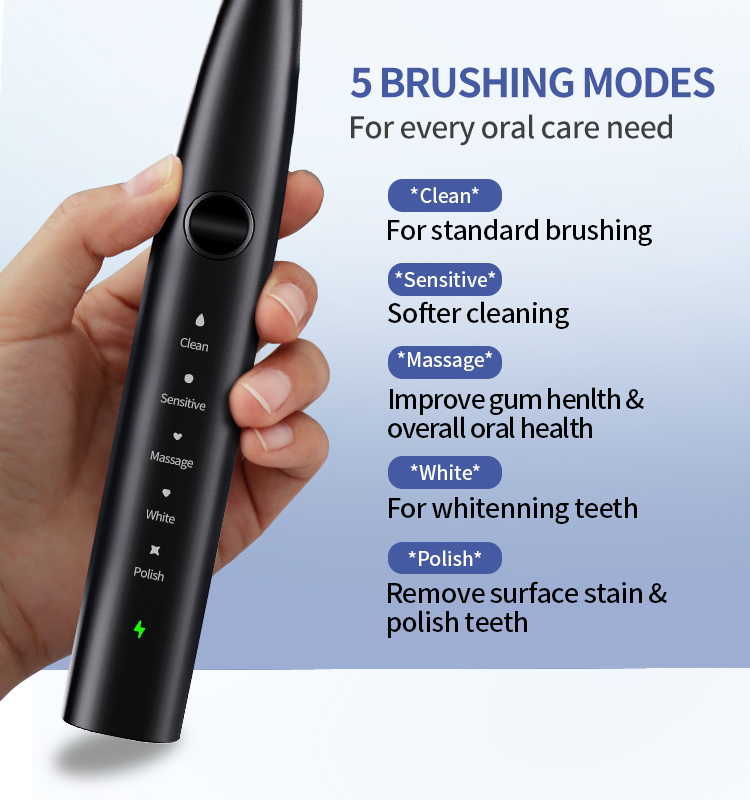 - 5 ВЫСОКОЭФФЕКТИВНЫХ РЕЖИМОВ ЧИСТКИ - Clean (бережная), White (интенсивная), Polish (интенсивная инвертированная частота), Milder (бережная инвертированная частота) и Sensitive (мягкая) - для соответствия различным состояниям зубов и десен, поэтому вы можете выбирать различные режимы в соответствии со своими предпочтениями и рекомендациями стоматолога.